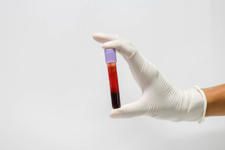 Test tubes with blood for analysis in a hand in a blue medical glove. On a white background. Lots of empty space