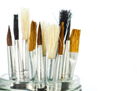 Brushes of different sizes on a white background. Artist's set. Artificial bristles. Preparation for work.