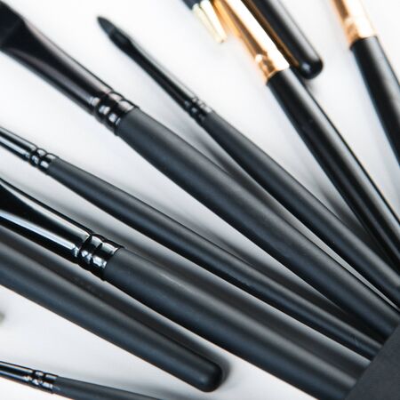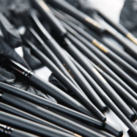 Decorative cosmetics and accessories for makeup, professional tools. Various make-up brushes, closeup photo