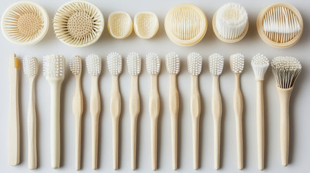 Vertical macro close-up photo of dental polishing brushes in dentistry, arranged in a fanned composition. Suitable for dental education, clinical materials, cosmetic dentistry, and marketing illustrations.