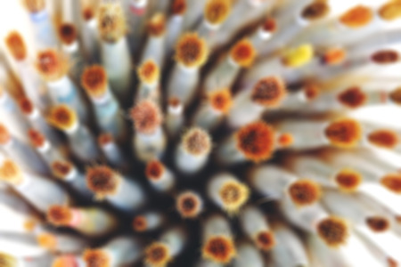 Make-up and fashion concept. Background of various textures, shapes, forms and colors make-up brushes placed in bucket. Vivid colorful filter. Selective focus and image with shallow depth of field