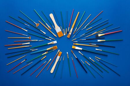 Set of art paint brushes of various color, size and bristle type laid out in circular burst pattern. Flat lay shot, isolated on blue background