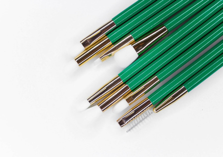 Brush brow and makeup artist in the set. Cut Bon and minimalism. Set of brushes and Flatley. Sterilization of instruments.