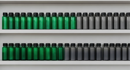 Two shelves filled with rows of small, uniform bottles. The bottles are split between green and grey colors, neatly organized on a white background.
