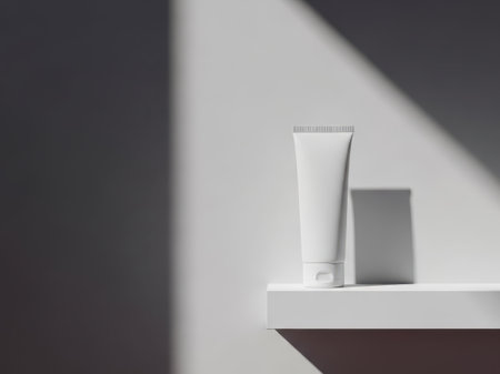 cosmetic bottle mockup on white shelf with shadow on the wall