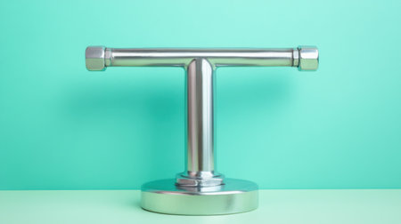 A sleek and modern metallic T-pipe fixture stands against a vibrant turquoise background, perfect for showcasing industrial design and decor concepts.