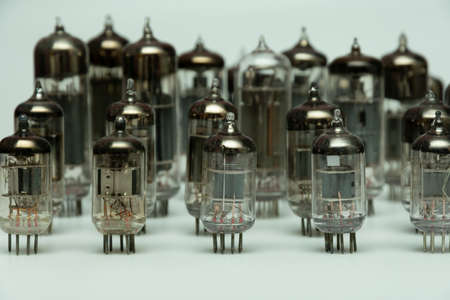 different vintage vacuum lamps for electronic amplifiers, audio players and tube TVs on a white background