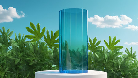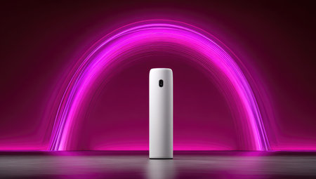 A cylindrical white device stands centered against a gradient backdrop, highlighted by a glowing neon arc. The composition features a symmetrical arrangement, with the device reflecting the neon light. Suitable for advertising or illustrating technology concepts, the image offers a clean and contemporary aesthetic, suitable for various applications.