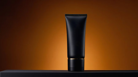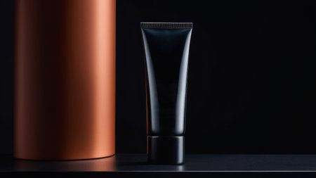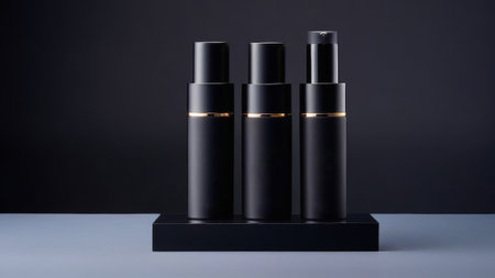 Black skin care products on a dark round podium stand with copy space and place for text, mockup, template, on a black to gray gradient background.