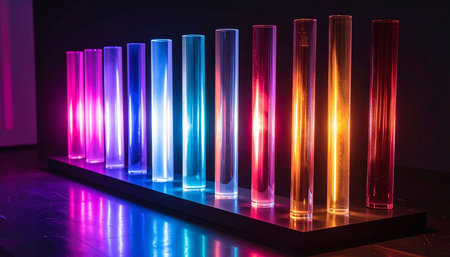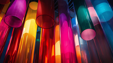 A low-angle shot captures a dynamic arrangement of translucent cylinders in vivid hues, creating an abstract composition of light and color.