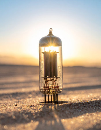A vintage vacuum tube stands like a monument against the setting sun, its delicate inner workings illuminated by the warm, golden light.