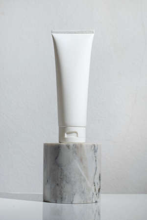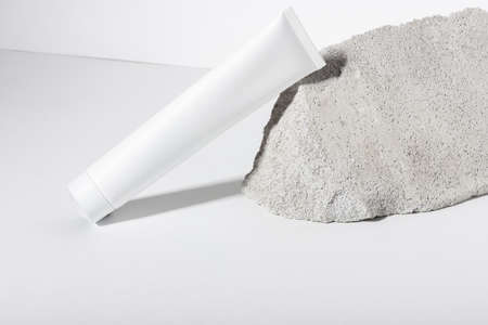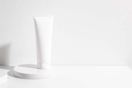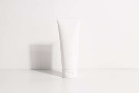 White cosmetic tube on a white background. A nourishing and moisturizing face cream, hand cream or lotion. Women's cosmetic tube with skin care product. Organic cosmetics, copy space on the right side