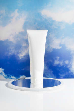 fresh beauty spa medical skincare and cosmetic lotion cream facial tube bottle packaging product on white decor background with summer season sun light