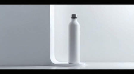 A minimalist image showcasing a sleek white water bottle with a silver cap, set against a clean, white backdrop, product photography.