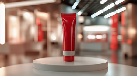A bright red cosmetic tube stands on a white pedestal against a softly blurred background of warm lights, evoking a modern retail setting.