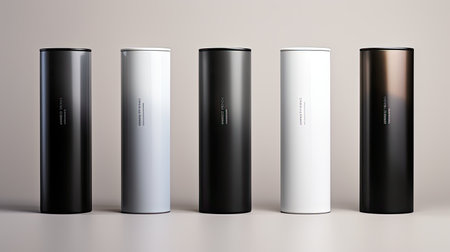 Three smooth matte cylinders arranged in varying heights with a soft gradient from beige to light gray tones set against a plain light background. The feature subtle shading and a clean...
