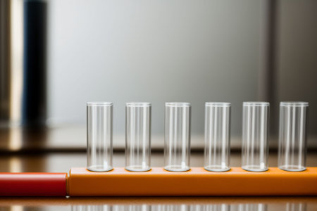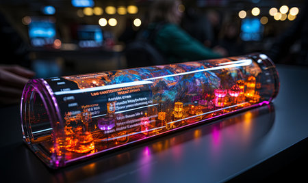 Close-up view of advanced laboratory equipment featuring colorful tubes and vibrant lights. The composition highlights innovative technology in a modern setting.