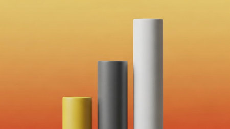 Three smooth cylindrical shapes in yellow grey and white arranged in ascending height against a gradient orange background with subtle horizontal lines and soft lighting creating gentle shadows