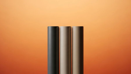 Three vertical metallic cylinders in silver and black stand against a smooth gradient orange background creating a minimalist and balanced composition with soft shadows and reflective surfaces
