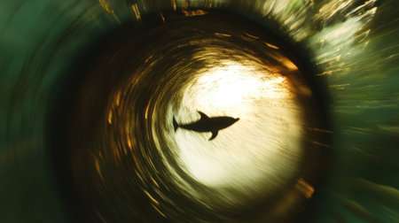 A mesmerizing underwater scene captures a shark silhouetted against the shimmering light, evoking a sense of adventure and tranquility in nature.