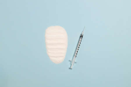 Syringe with a needle and medicine on a blue background with a copy space. White powder drug heap, top view
