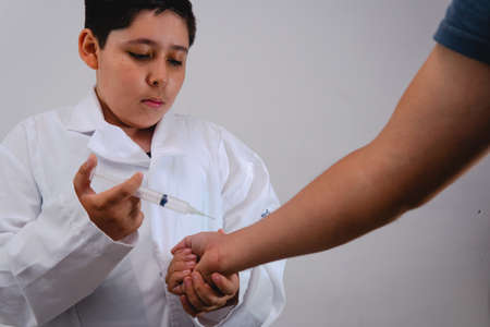A boy disguised as a doctor in a large white coat with a needle about to vaccinate a patient in his arm. Boy dressed as a doctor with an injection for a person.