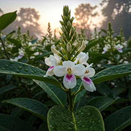 Delicate white blooms flourish on green stems, bringing a sense of calm to the setting.