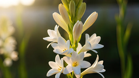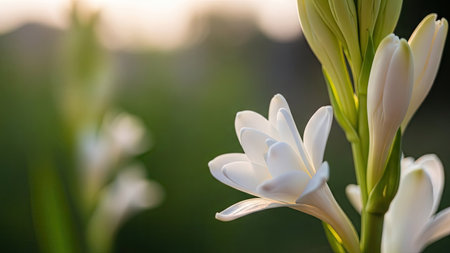A close-up shot of a tuberose flower in bloom, showcasing its delicate white petals and vibrant green stem against a blurred background.