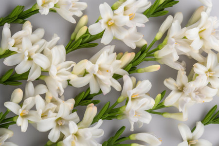 Floral background. Freesia flowers on a white background. Minimal concept. Flat lay, top view. Copy space for text.