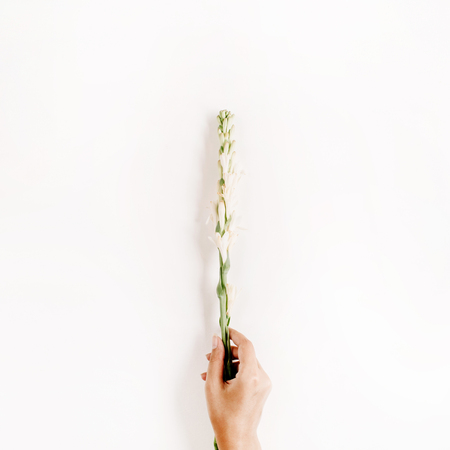 Girl's hand holding white flower on white background. Flat lay, top view.