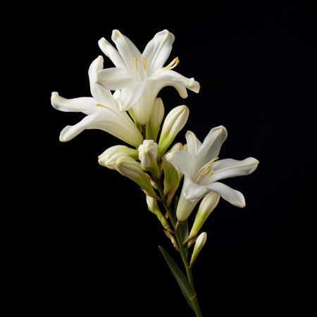 a majestic tuberose flower stands tall against a stark black backdrop, its pristine white petals adorned with intricate native brazilian motifs. photorealistic detail captures the graceful curves and organic architecture of this stunning bloom, inspired by the works of cicely mary barker and martin puryer. high-contrast photography highlights the flower's elegance and ethereal beauty. ai generated
