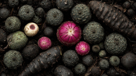 A detailed image showcases a collection of fruits, berries, and pine cones. The composition features various shapes and sizes in a mostly dark, natural environment. The color palette includes shades of green, black, and touches of pink and white. The photograph is suitable for various commercial uses, including illustrations and editorial content.