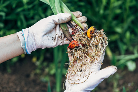 hand holding gladiolus flower bulb onion before planting