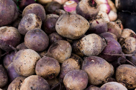 Sweet potato at small local urban market. Organic produce on sale at outdoor farmer market. Selling fresh crops and veggies harvest. European urban setting. Close up. Part of the series