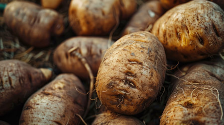 A close-up shot capturing a cluster of freshly unearthed potatoes, showcasing their variety in color, size, and form, reflecting the essence of natural farming