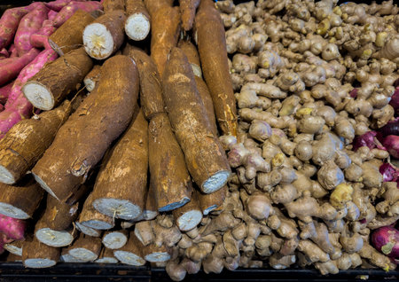 Brazilian popular fair, Table with cassava, ginger, red onion, and yam.