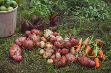 Flat lay of assortment of fresh root vegetables, bio healthy, organic food