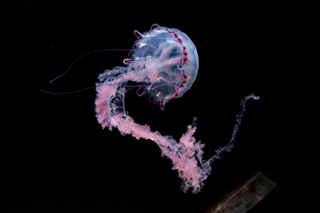 Fuorescent jellyfish swimming underwater aquarium pool with pink neon light. The South American sea nettle chrysaora plocamia in blue water, ocean. Theriology, tourism, diving, undersea life.