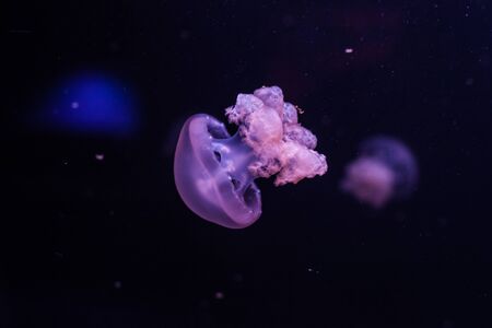 Close-up Jellyfish, Medusa in fish tank with neon light. Jellyfish is free-swimming marine coelenterate with a jellylike bell- or saucer-shaped body that is typically transparent.