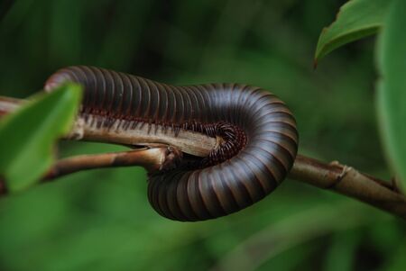 The millipede on the branch with blurry background.