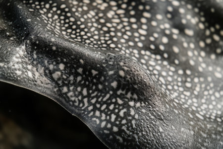Close-up of stingray skin, rough, pebble-like surface with tiny white speckles.