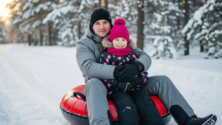 Happy dad and son are sliding from snow hill at tubing. Winter outdoor activity.