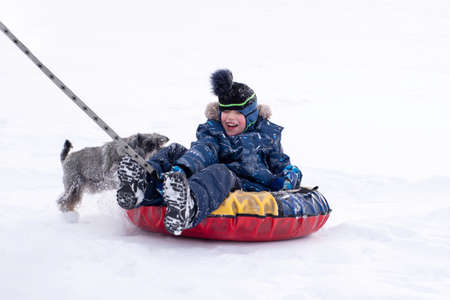 A boy in winter clothes rides an inflatable sled on the white snow, a dog plays with a boy