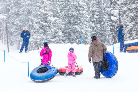 Happy Children Snow Tubing on Inflatable Sleds, Winter Fun and Outdoor Adventure