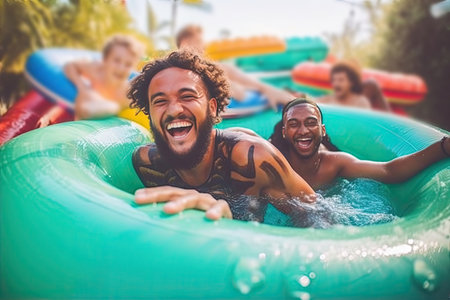 Happy Friends on an Inflatable Circle in Pool, Water Park Fun, Laughing Youth in Rubber Ring, Generative AI Illustration