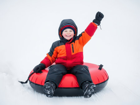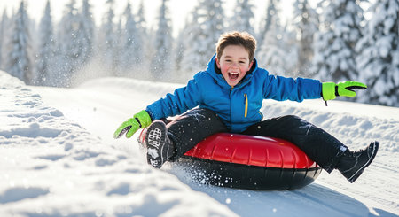 Cheerful child enjoying a snowy day, sliding downhill on an inflatable snow tube, surrounded by winter wonderland scenery
