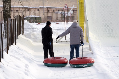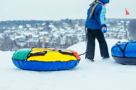 Intention to go tubing on a winter day from a mountain in the snow. A man hand holds one of the tubes by the handle