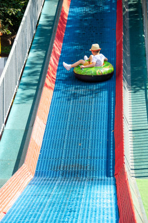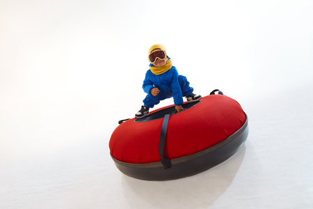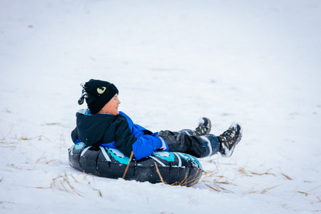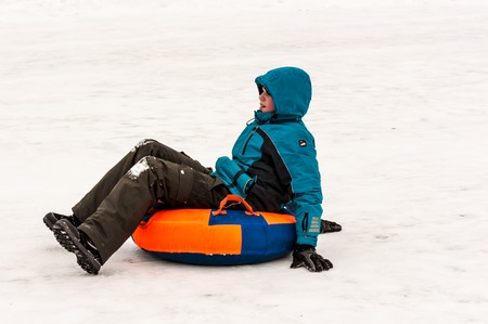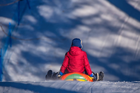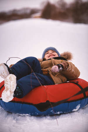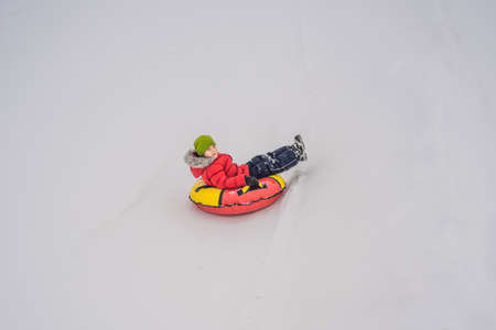 Child having fun on snow tube. Boy is riding a tubing. Winter entertainment. kid sliding downhill on a tube