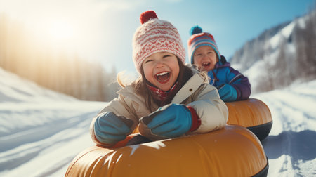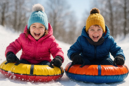Kids slide down a snowy hill on colorful inflatable tubes, wearing cheerful hats and mittens. The sun shines through trees, creating a joyful winter atmosphere.