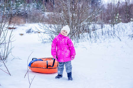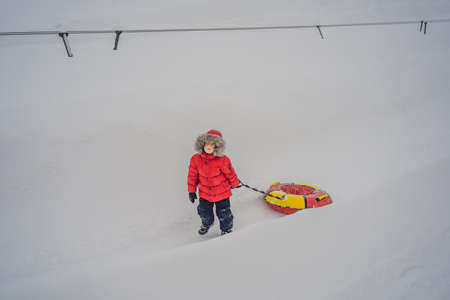 Cheerful little boy in winter walks in the cold on an inflatable sled